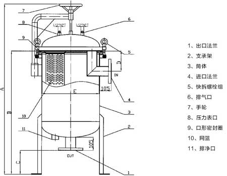 袋式過濾器是一種壓力式過濾裝置,主要由過濾筒體、上蓋、快開裝置、支撐網(wǎng)籃等部件組成。液體由設(shè)備入口流進(jìn),經(jīng)濾袋過濾后從出口流出,雜質(zhì)被攔截在濾袋之中,維護(hù)時(shí)只需更換濾袋即可。此過濾器內(nèi)部采用濾袋作為過濾元件,濾袋由金屬網(wǎng)籃支撐,適合液體精密過濾,去除其中的微量細(xì)小雜質(zhì) 。此過濾器具有結(jié)構(gòu)簡(jiǎn)潔,操作快捷靈活,耗材經(jīng)濟(jì)的優(yōu)勢(shì),并配備多種高性能濾袋,能夠滿足絕大多數(shù)過濾要求。