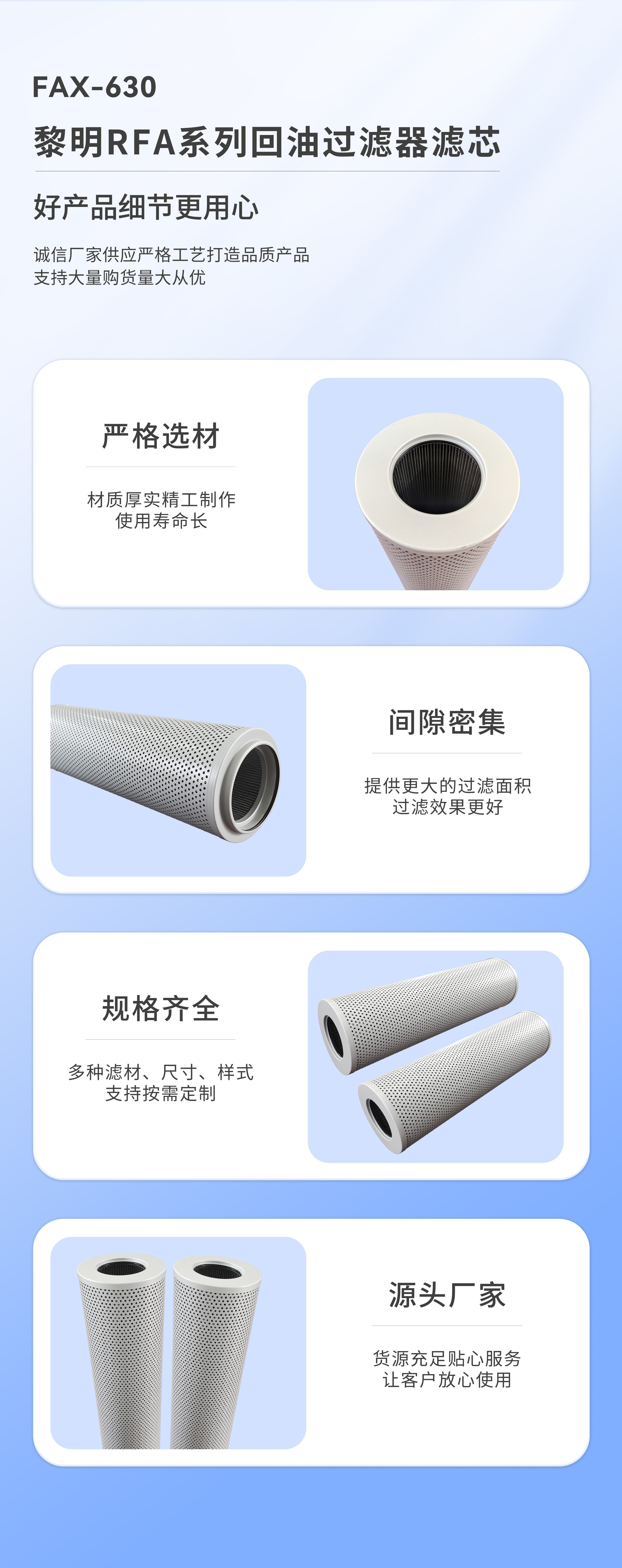當(dāng)液壓系統(tǒng)中的過濾液體由過濾器進口進入時,經(jīng)濾芯自外向里透過濾層而被過濾成澄清液體,然后經(jīng)管路出口排出,污染物雜質(zhì)被截留在濾芯的深 層及表面,從而達到較高的過濾效率。濾芯精度的高低、結(jié)構(gòu)尺寸的確定是由其過濾時的流量和過濾介質(zhì)的特性所決定的。濾芯的濾材均為國產(chǎn)/進口玻纖或不銹鋼濾網(wǎng)組成,結(jié)構(gòu)合理,波紋整列均勻,流量大,受阻力小。 黎明RFA直回式回油濾芯性能與特點: