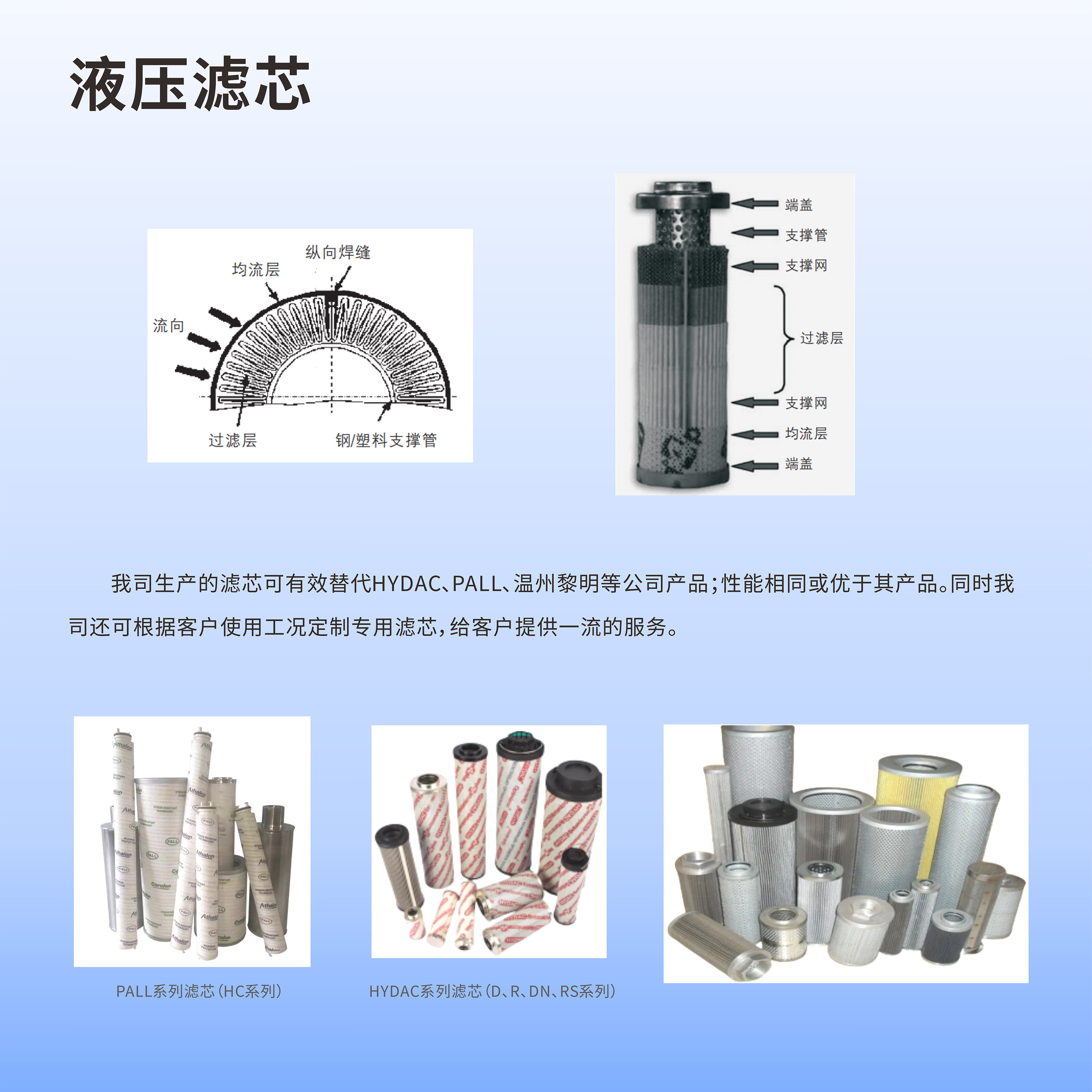 【產(chǎn)品簡介】:液壓濾芯由上、下端蓋,濾層(由過濾層、支撐層、均流層)以及骨架組成,濾層以圓柱體的形狀以圓柱體的形狀固定在內(nèi)、外骨架之間,并在上、下端蓋處密封,應用時根據(jù)實際情況確定液體的流動方向(從濾芯外流向濾芯內(nèi)部或從內(nèi)部流向外部)。流量:400L/min 精度:80、100、180微米可選。