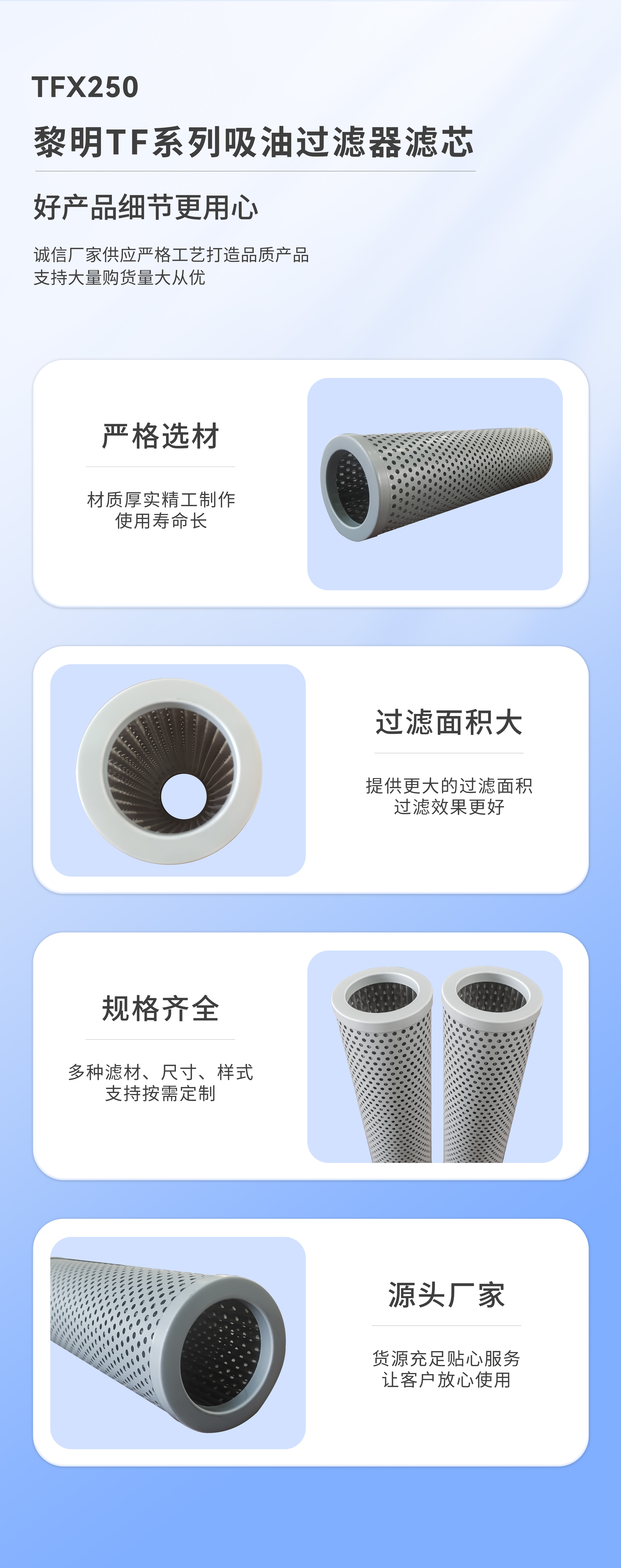 液壓油濾芯是輸送介質(zhì)的管道系列中不可缺少的部分,通常安裝在液壓系統(tǒng)的進(jìn)口端過濾中用來濾除流體介質(zhì)中的金屬顆粒,污染雜質(zhì),用于保護(hù)機(jī)器設(shè)備的正常運(yùn)行工作。液壓油濾芯主要安裝在液壓系統(tǒng)中的:吸油路上壓力油路上,回油管路上,旁路上單獨(dú)的過濾系統(tǒng)上。 流量:250L/min 精度:80/100/180微米可選。液壓油濾芯產(chǎn)品優(yōu)勢: